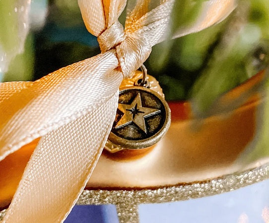 All Texan Christmas ornaments are embellished with an antique gold charm, combining both the Lone Star and the Star of Bethlehem. This unique detail honors the state of Texas while celebrating the birth of Jesus Christ, which is the true reason for the season.