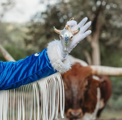 Each Texan Christmas ornament is crafted from traditional hand-blown glass, ensuring strength and durability. Measuring approximately 5 inches, these oversized ornaments make a striking statement on any Christmas tree.