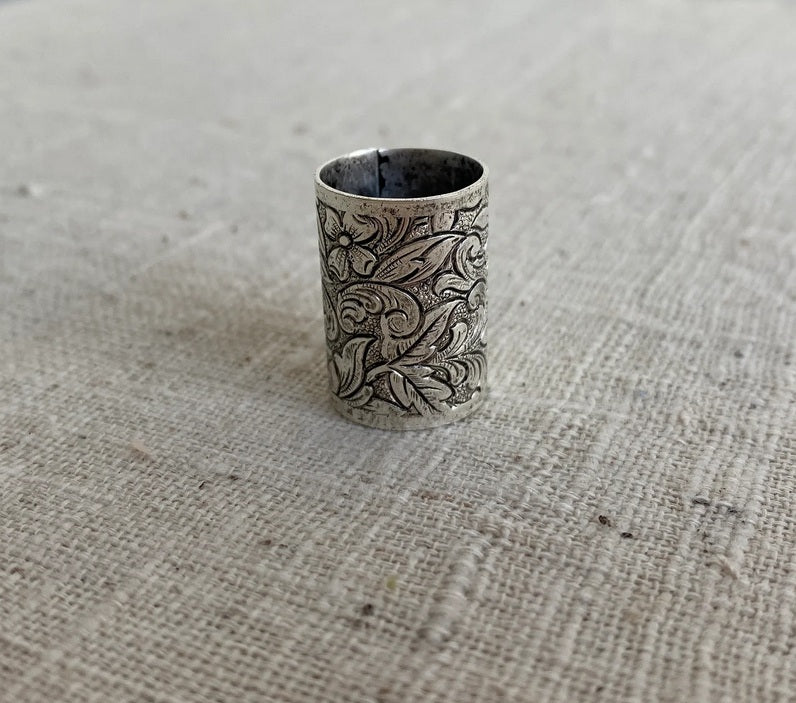 Dress up your bandana or scarf with a stamped slide. The floral and filigree patterning is nod to traditional tooled leather work.