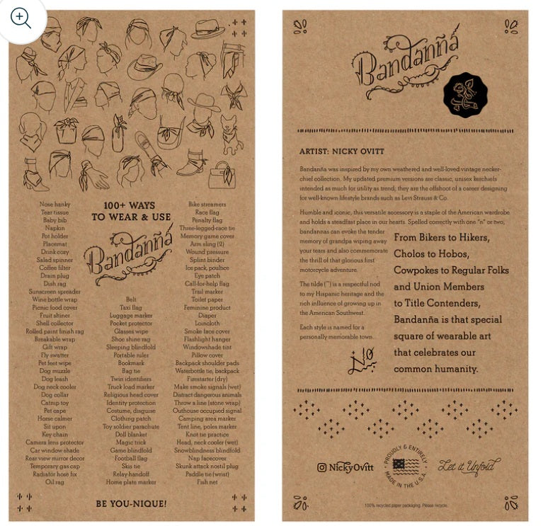 • 2-sided insert describing 100+ Ways to Wear and Use Bandanña.