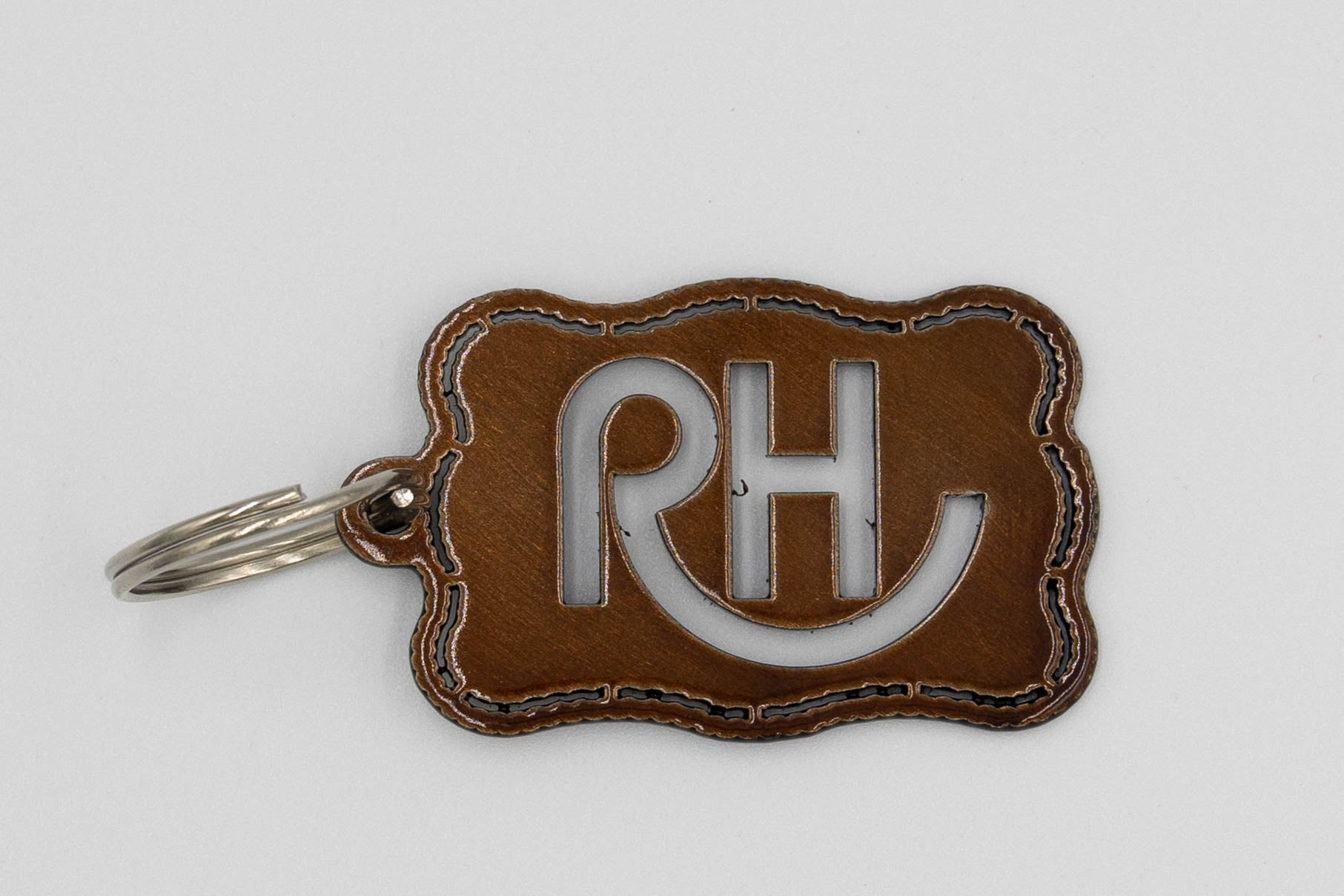 This handcrafted metal keychain features the signature RH brand on a unique scalloped-edge rectangle - blending rugged western charm with everyday function. Made by artisan JDH Iron Designs and available in three different rustic finishes, it's a durable and stylish way to keep a little piece of ranching heritage in your pocket.