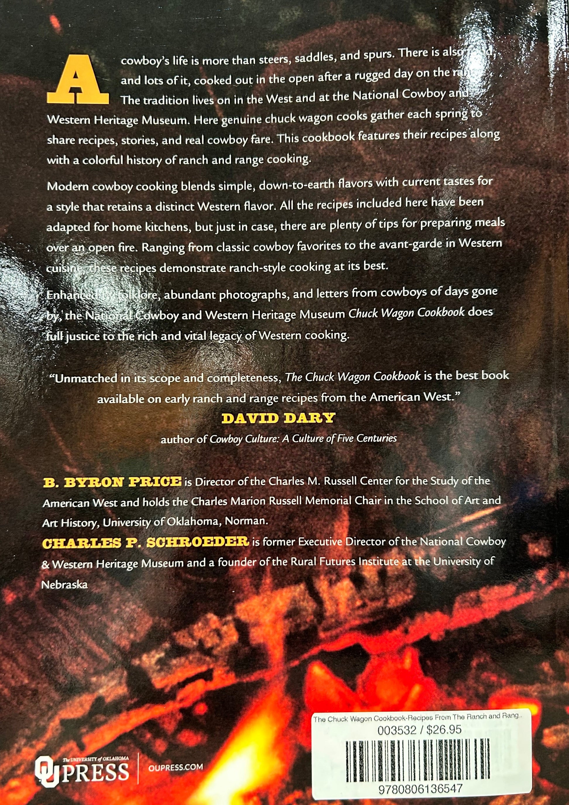 A cowboy’s life is more than steers, saddles, and spurs. There is also food, and lots of it, cooked out in the open after a rugged day on the range. The tradition lives on in the West and at the National Cowboy and Western Heritage Museum. Here genuine chuck wagon cooks gather each spring to share recipes, stories, and real cowboy fare. The cookbook features their recipes along with a colorful history of ranch and range cooking.